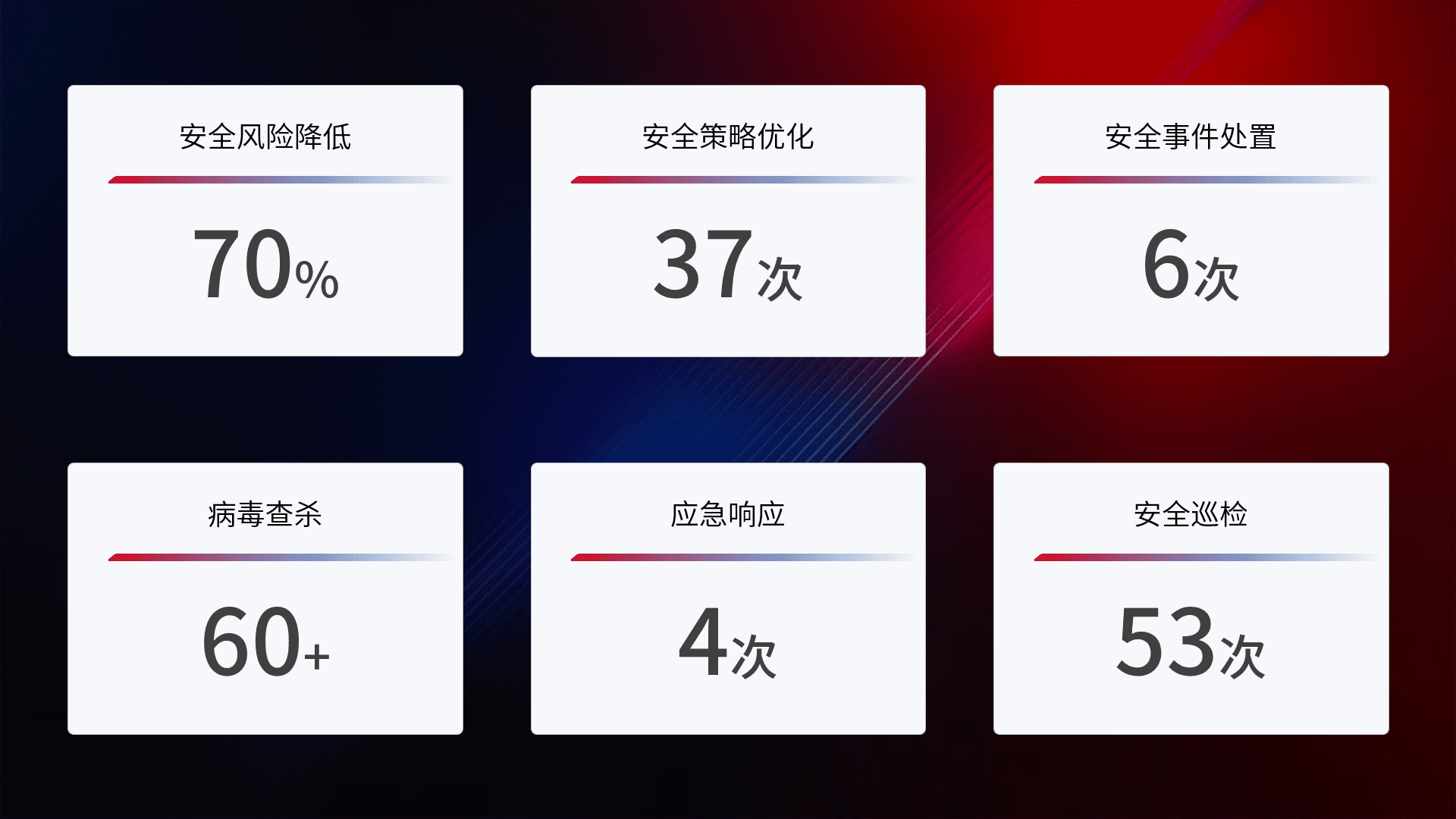 提供全面的安全事件报告体系,,,包括处置报告、、周报、、、季度和年度总结,,,,结合持续监控,,,帮助客户深入了解网络安全状况。。