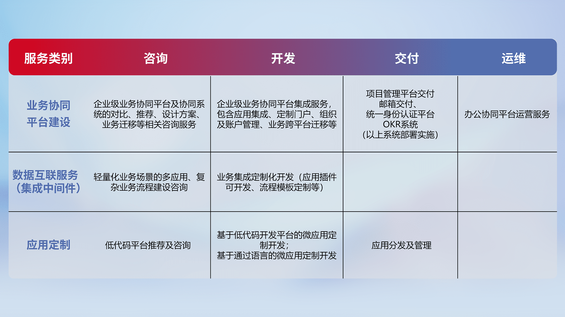 针对钉钉、、、企微、、、IDaas等平台级产品提供产品的规划、、、方案、、、交付、、、定制化开发等服务,,,,实现如统一协同办公、、智能客户服务、、混合会议管理、、、智能数据查询、、、等业务场景,,,,实现数字化转型。。