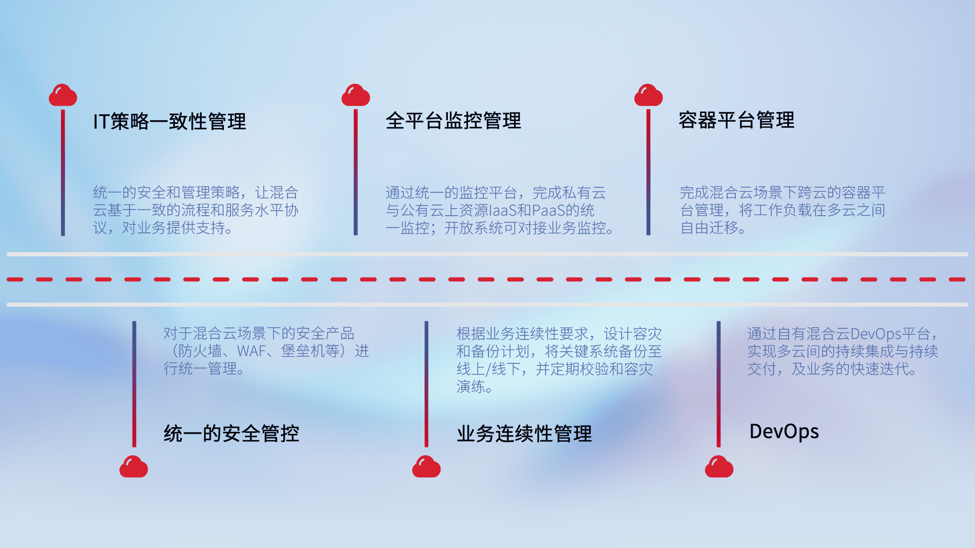 通过多云纳管,,,,以统一的资源数据模型把客户的云资源进行抽象和封装,,进而实现对多云资源的统一操作,,,,保障云资源管理的可靠性、、、、稳定性与可用性。。。。量身定制化运维内容,,配置、、开发运维、、、补丁管理、、、、备份、、、、监控、、、、认证和访问管理、、审计和日常巡检等,,,,保障在用云过程中的可靠度,,,,稳定度以及高可用率。。。。