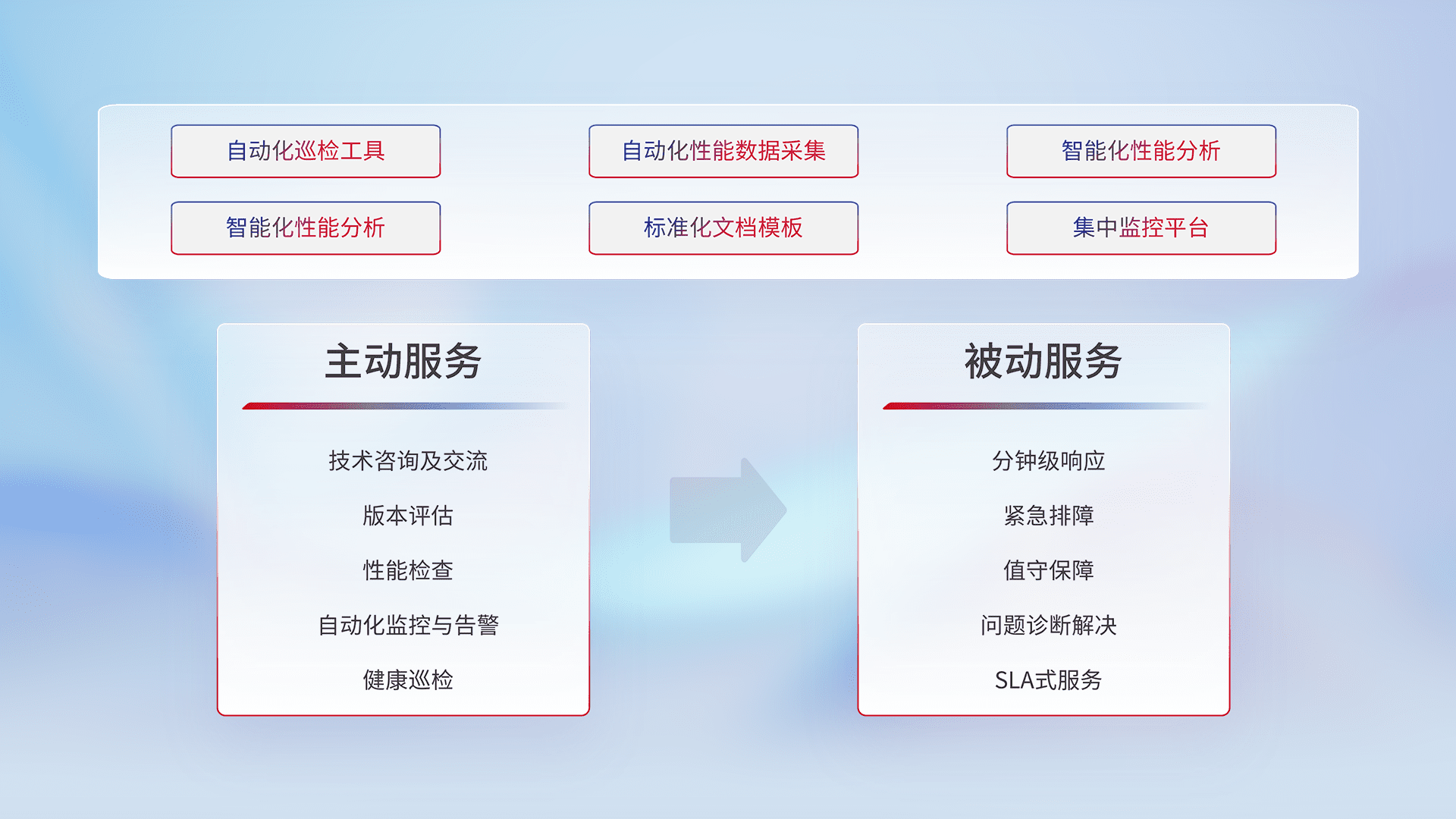 智能化工具和标准化文档,,,保障服务质量,,,,提供主动服务(包含技术咨询、、、版本评估、、、、性能检查、、、自动化监控与告警、、、、健康巡检)和被动服务包含(分钟级响应、、、紧急排障、、、、值守保障、、、问题诊断解决、、SLA服务)。。。。