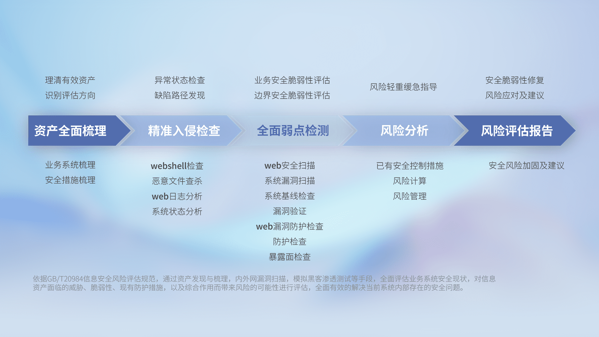 针对客户行业特性,,,以专业的安全服务+多厂商联合解决方案提供专属的一站式安全管理服务,,,,帮助客户全面感知网络空间威胁,,,,基于识别、、、检测、、分析、、、、防护、、、、监测、、响应的服务理论模型,,,,从方案咨询、、集成交付、、评估验证、、、、优化加固、、、、运维运营,,,致力于为客户提供完整的闭环管理式安全服务。。以实战经验为客户打造高抵御风险的安全体系,,,帮助客户发现威胁、、、对抗威胁、、、、处置威胁,,,不断积累安全对抗能力,,持续保障数字化安全。。